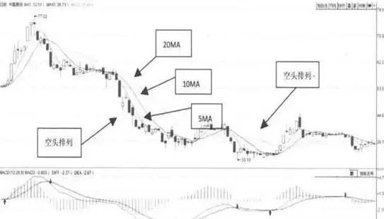 在短线T+0操作中,为了更精准地判断股价走势,常以短期移动平均线为依据。如果均线方向向下,且从上到下依次为长期均线、中期均线、短期均线,则为空头排列,为股价看跌信号。