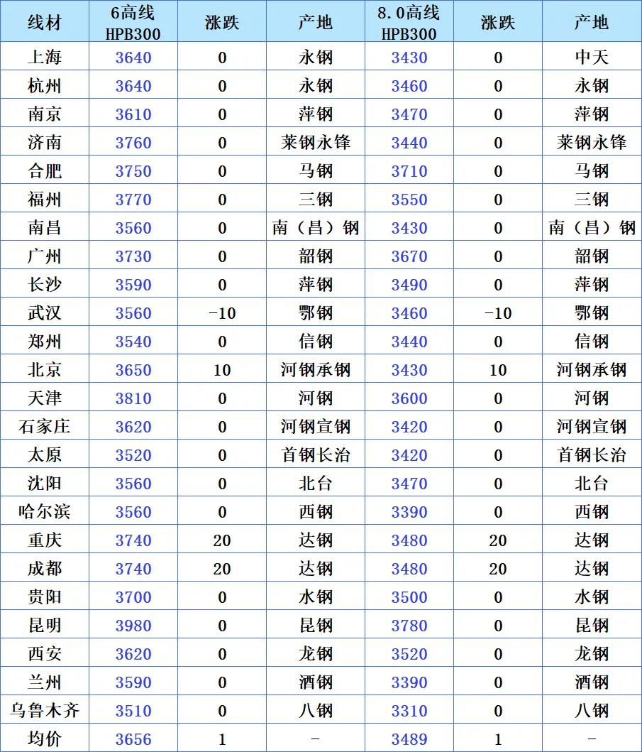 当前国内线材市场整体价格平稳,仅局部城市出现小幅波动,其中武汉市场的 6 高线和 8.0 高线价格均下跌 10 元,北京市场价格上涨 10 元,重庆、成都市场价格则上涨 20 元。从均价来看,6 高线 HPB300 均价为 3656 元,8.0 高线 HPB300 均价为 3489 元,整体呈现稳中有升的态势。
