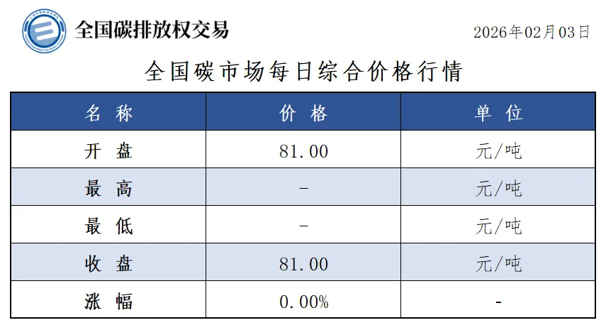 今日全国碳市场无成交,综合价格收盘价81.00元/吨。