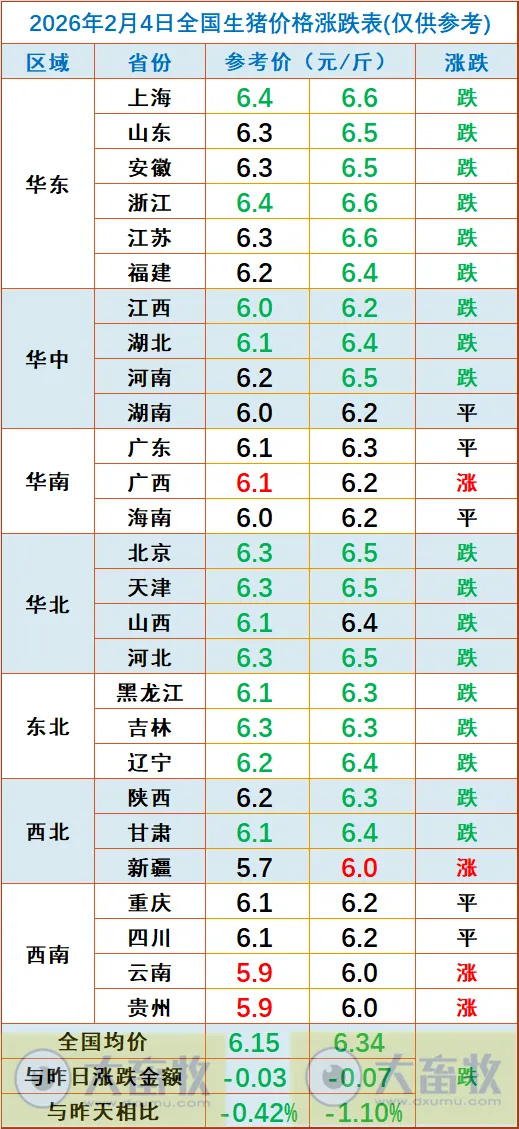 大畜牧根据我国27省的猪价数据,计算出2026年2月4日全国平均猪价为每斤6.24元,比昨天下跌0.05元,跌幅为0.76%,止涨转跌,结束连续3天的上涨。