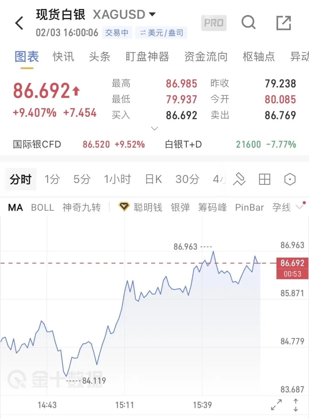 现货白银价格再突破85美元关口,报86.692美元/盎司,最高触及86.985美元/盎司,单日暴涨近10%。值得一提的是国投白银LOF2日晚间更新净值后,单日净跌幅达31.5%,创公募基金单日下跌历史记录。而在今日(2月3日),国投白银LOF复牌后再度跌停,报4.25元。