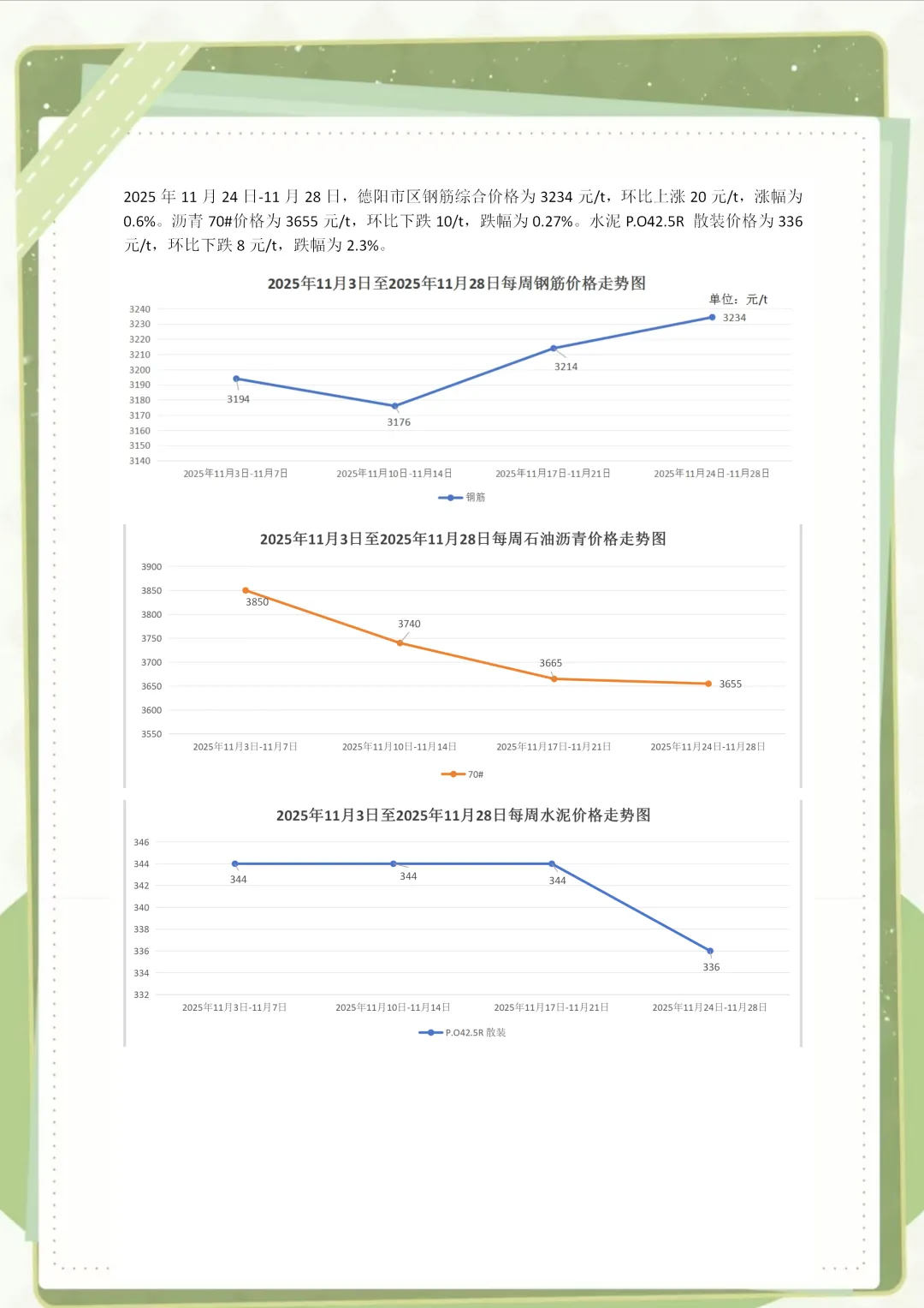德阳市钢筋价格上涨,石油沥青、水泥价格下跌(2025年11月24日-11月28日)