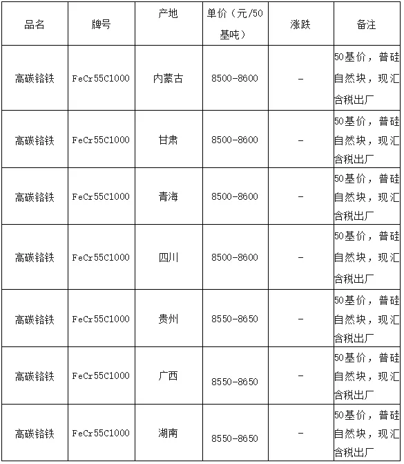 品名 | 牌号 | 产地 | 单价(万元/50基吨) | 涨跌 | 备注 |