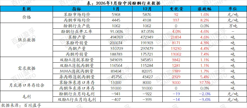 1月苯酚产量494763吨,环比12月份增加21814吨;苯酚外销量200074吨,环比12月份增加8171吨;1月丙酮产量310709吨,环比12月份增加13230吨;丙酮外销量188783吨,环比12月份增加13062吨。