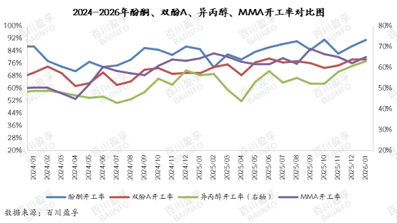 双酚A装置1月开工率在78.83%,环比12月提升0.46%,MMA装置本月开工率在65.02%,环比12月提升4.79%。异丙醇装置本月开工率在63.05%,环比12月提升3.91%。