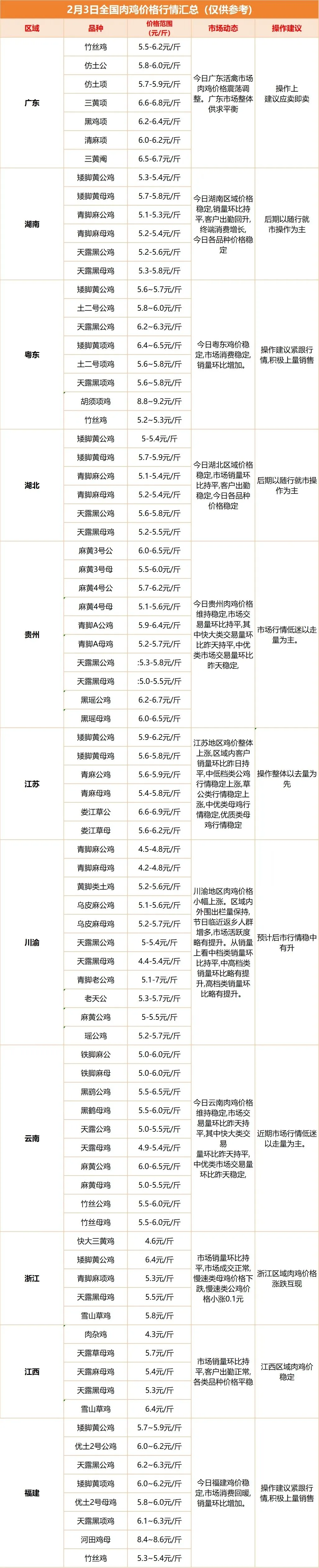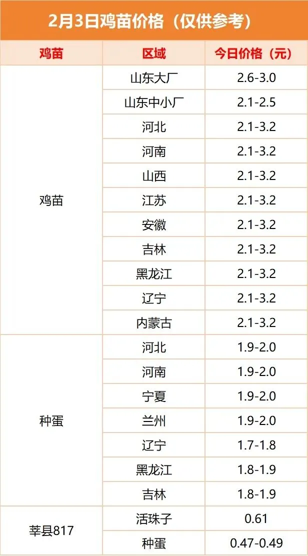 >今日全国肉鸡、鸡苗、鸭苗价格(2月3日)