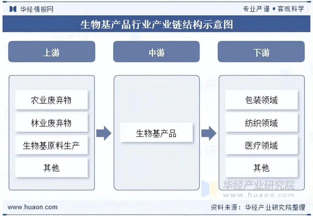 生物基产品行业产业链结构上游为原材料,主要为农业废弃物、林业废弃物、生物基原料生产等;产业链中游为生物基产品生产;产业链下游为生物基产品应用领域,主要为包装领域、纺织领域、医疗领域等。