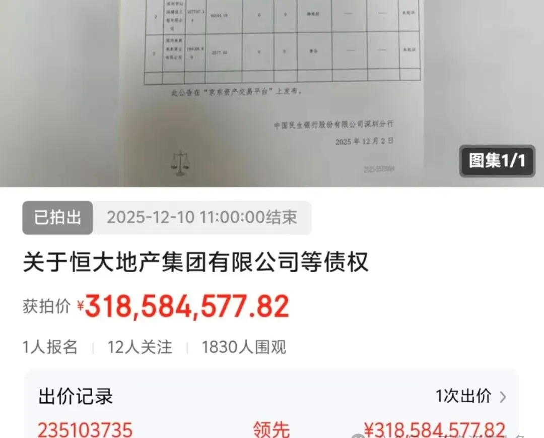 近日,民生银行深圳分行本息合计23.59亿的恒大地产金融债权包,最终以3.19亿元的价格转让成功,若按本金计算,不到2折,且有土地做抵押,扎扎实实的骨折价。