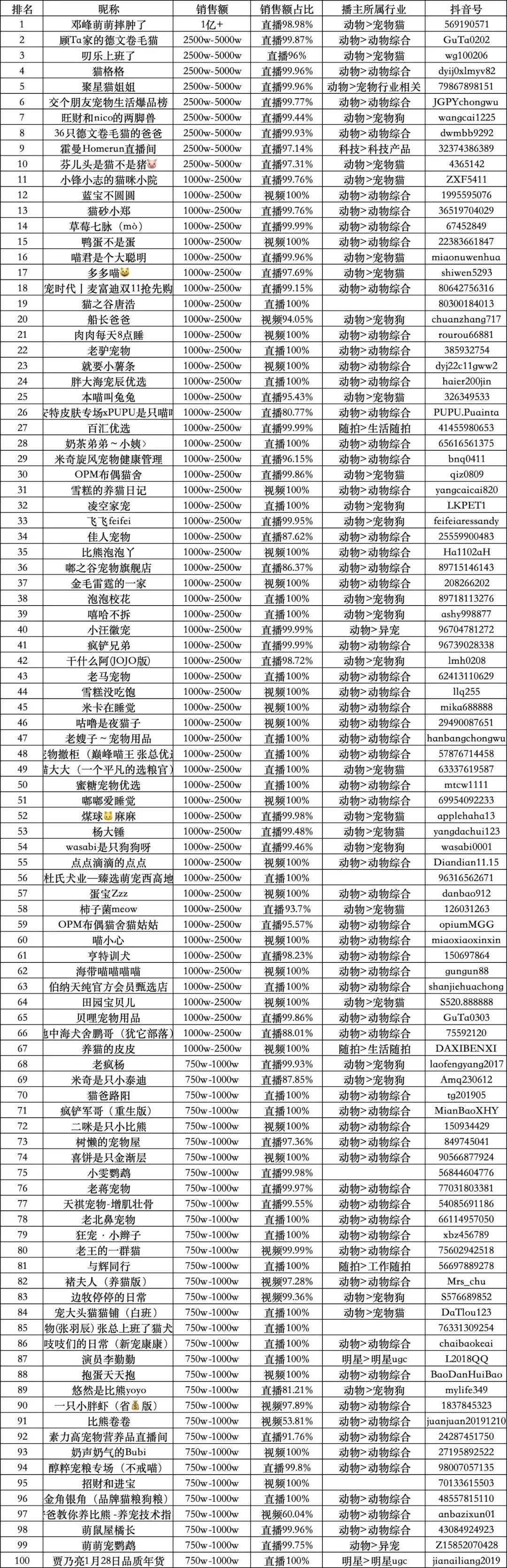 (完整版Top2000,加入「杨Sir宠物圈」获取)在品类分布上,“猫经济”展现出压倒性优势,围绕猫咪的内容与产品销售构成了榜单主力。与此同时,专业化、细分化趋势显著,从活体、食品、用品到健康管理,完整产业链各环节均涌现出代表性达人。