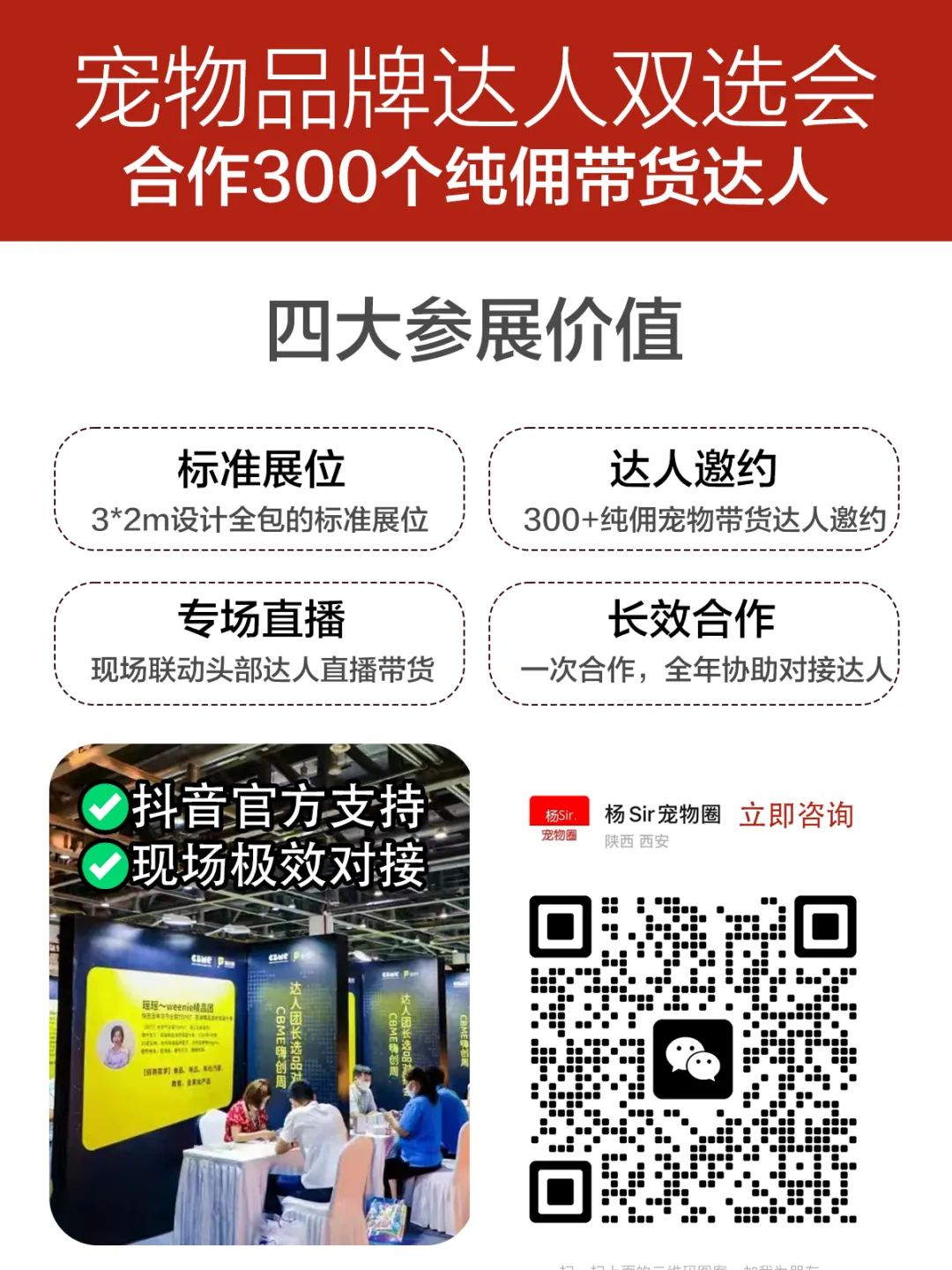 2025年3月24-25日杭州,杨Sir发起「宠物品牌达人双选会」,邀请300-500个宠物带货达人来现场选品、带货。名额有限,如果你有参展需求,可以下方联系我锁定席位!