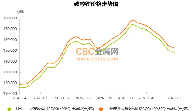 今日中国电池级碳酸锂(Li2CO3≥99.5%)市场含税现款报价下跌,目前在150100~154900元/吨,均价152500元/吨,较昨日下跌3000元/吨。