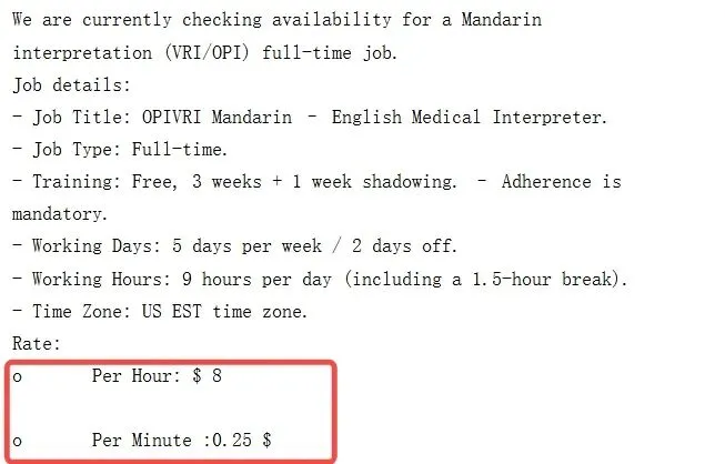 今天邮箱里收到一封邮件,是某翻译机构在招聘远程视频电话口译员。看到这个全职的时薪,我是着实被吓得不轻。远程视频电话口译(VRI/OPI)是欧美常见的一种口译形式。