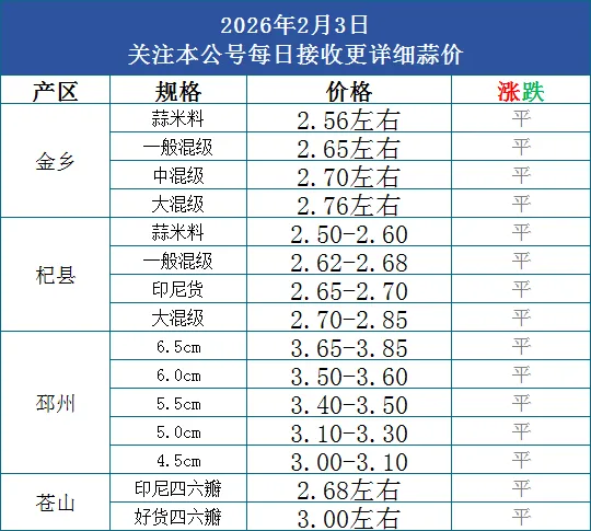 今日金乡大蒜价格整体平稳运行,货源以原有为主,整体供应略显偏多,买家拿货积极性不高,部分有推迟观望表现,卖家多随行卖货,部分要价显松动。