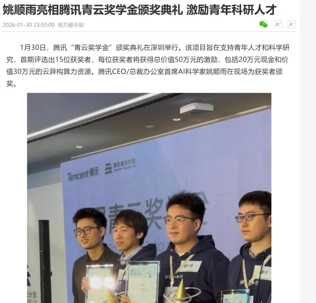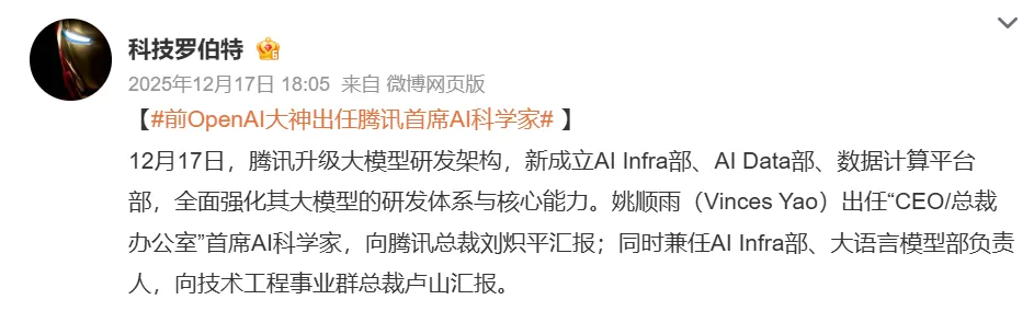 2025 年 9 月,腾讯通过青云计划将他纳入麾下,不仅让他出任 “CEO” 首席 AI 科学家,还让他兼任大语言模型部、AI Infra 部负责人,直接向腾讯总裁刘炽平汇报。