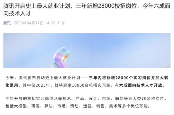 而面向广大普通同学的实习与校招布局规模更为庞大,腾讯启动史上最大规模就业计划,三年内将新增 28000 个实习岗位并大幅提高转正录用比例。