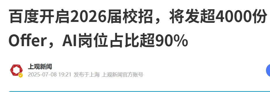 百度 2026 年面向全球毕业生释放超 4000 个校招岗位,AI 岗位占比突破 90%,几乎以 AI 相关人才为核心招聘主体。