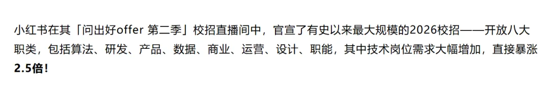 小红书开启史上最大规模校招,整体技术岗位需求暴增 2.5 倍,AI 相关研发与应用岗位占据主要增量,人才需求空间十分可观。