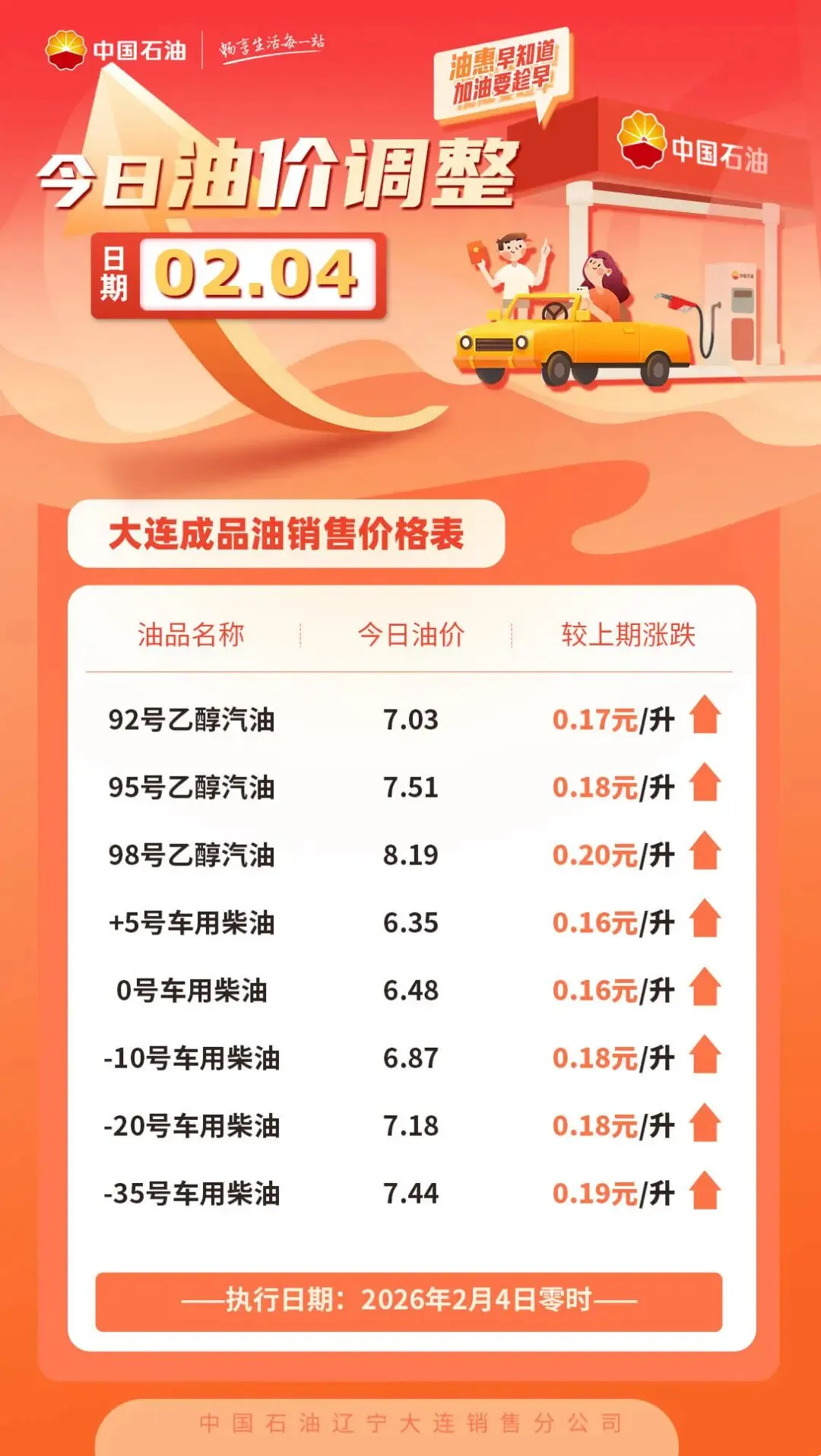 按照中国石油辽宁大连销售分公司提供的数据,2月4日零时起,该公司在大连地区的: