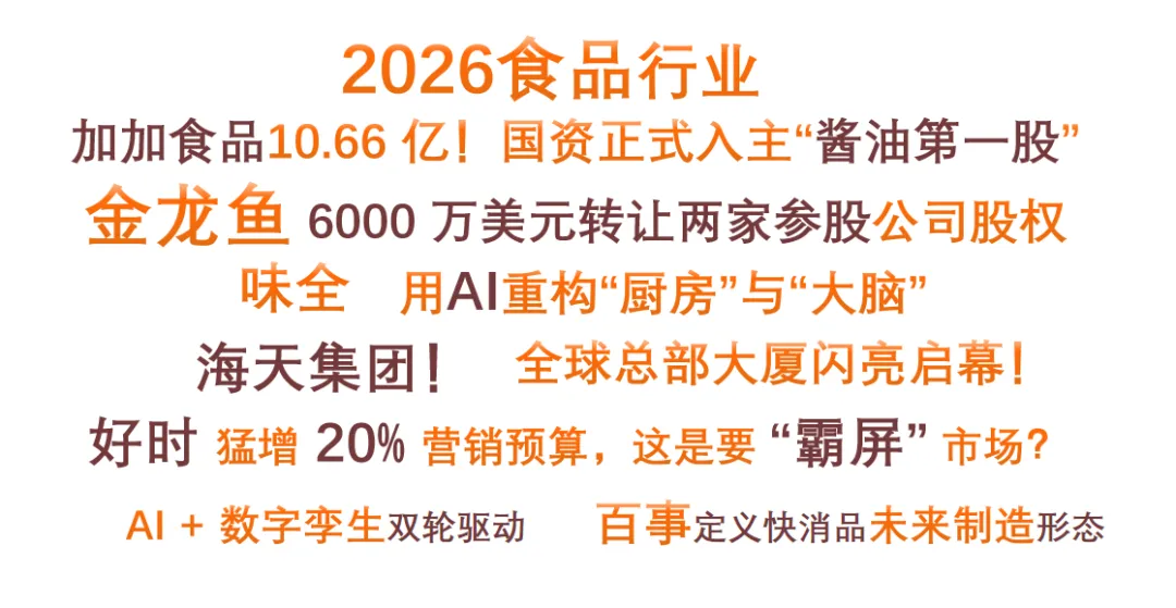 2026 年 1 月,中国东方资产管理公司以 10.66 亿元司法竞拍价拿下加加食品 23.42% 股权,成为第一大股东,创始人杨振家族持股降至 18.79%,失去控制权。此次易主源于 2018 年湖南卓越投资债务违约的强制执行。加加食品因产品创新滞后、渠道转型慢、跨界投资拖累主业等问题长期亏损。而中国东方作为 AMC,缺乏消费品运营经验,未来让加加食品扭亏为盈仍面临巨大挑战。(来源:调料家)
