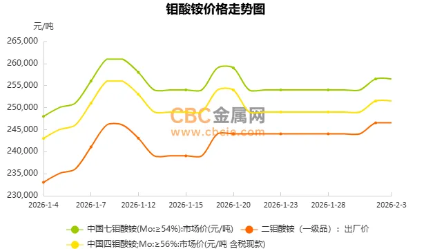 今日中国七钼酸铵(Mo≥54%)市场含税现款报价平稳,目前在255000~258000元/吨,均价256500元/吨,较昨日无变化。