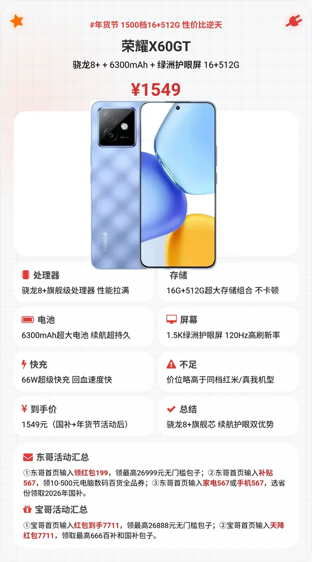 到手价才1549元,直接把千元机性能卷到天花板!谁能想到,1500出头能买到骁龙8+旗舰芯?这颗芯片以前可是高端旗舰机的专属配置,性能直接拉满✅ 16G大内存加持,多开APP、刷短视频、玩《王者荣耀》高刷模式,全程丝滑无卡顿,没有一点掉帧顿挫感,日常使用更是绰绰有余。更绝的是6300mAh青海湖大电池,堪称续航利器,重度使用一天完全无压力,给长辈用再也不用天天催着充电,而且屏幕还支持护眼模式,长时间用机也不费眼,买过的人都夸“性能够劲、续航耐用”!