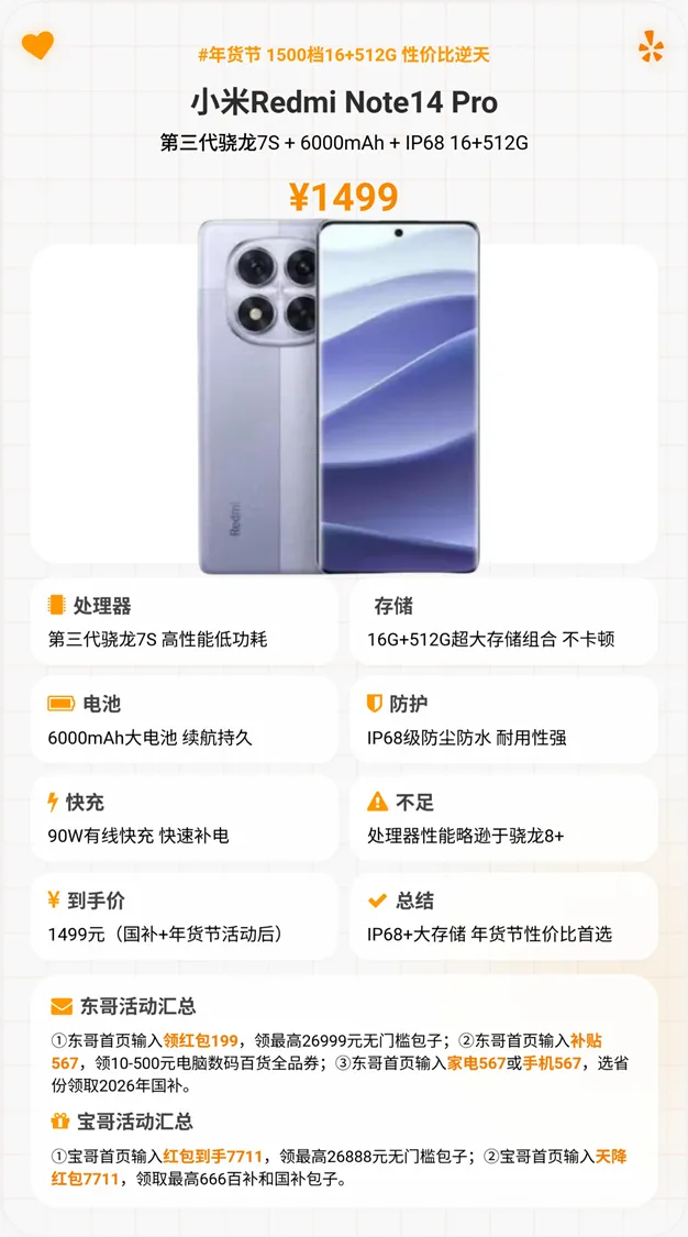 到手价1499元,堪称千元机里的“耐用王”,性价比直接拉满!第三代骁龙7S芯片,虽然不是顶级,但完全能应对日常办公、刷视频和主流手游,不玩大型网游的话,流畅度绝对够用。最惊喜的是,它竟然有旗舰级IP68防水,要知道这配置以前只在几千块的旗舰机上才有,再加上康宁大猩猩玻璃和五星抗摔认证,日常不小心摔一下、溅点水,完全不用慌,裸机使用也底气十足,再也不用小心翼翼护着手机,打工人、学生党糙着用也没问题!