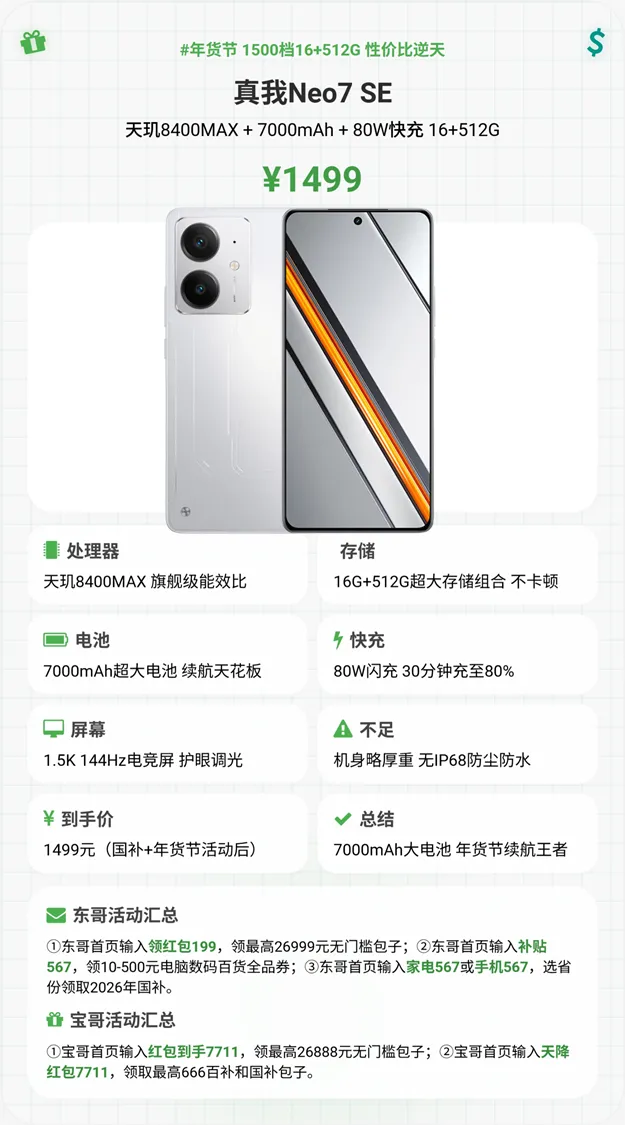 同样1499元到手,续航直接碾压同级所有机型!7000mAh泰坦巨无霸电池,比同价位机型多了近1000mAh,重度使用一天半完全无压力,轻度使用甚至能两天一充,彻底告别电量焦虑。天玑8400max芯片性能在线,日常使用、轻度游戏全搞定,刷视频、聊微信、玩小游戏,全程丝滑不卡顿。最难得的是,它还有立体双扬、NFC等全功能配置,刷门禁、听音乐都方便,完全没有千元机的妥协感,口碑清一色好评,堪称“千元机全能王”!