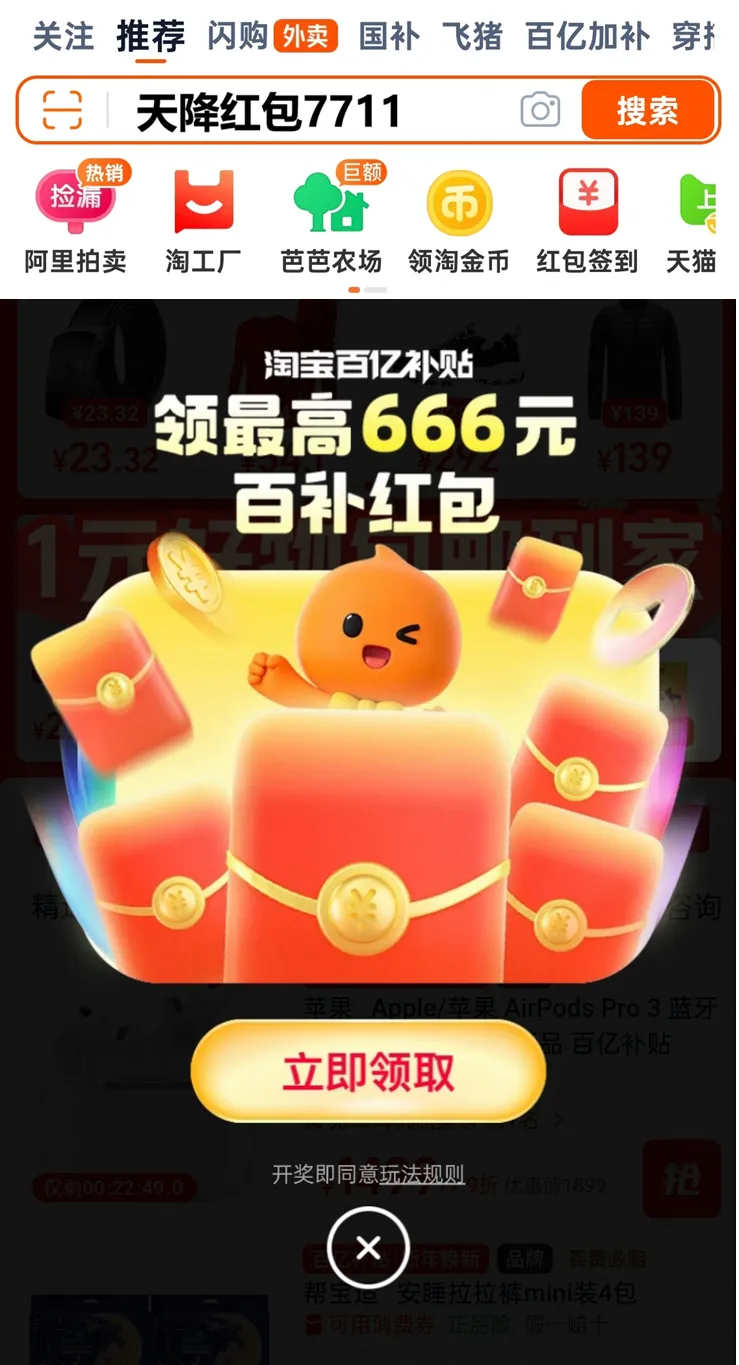 【淘宝平台】打开淘宝首页,搜索“天降红包7711”,额外领取最高666元红包,领完后直接去年货节主会场参与活动,优惠券和红包可以叠加使用,下单前记得核对一下,确保所有优惠都用上,避免错过省钱机会。