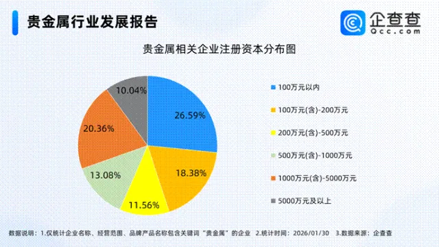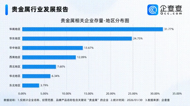企查查数据显示,截至1月30日,国内现存贵金属相关企业6.49万家。近十年相关企业注册量呈上下波动态势,2025年全年注册量重回万家,同比增长50.72%至1.1万家。截至目前,今年已注册0.11万家。存量方面,从注册资本来看,注册资本在千万元及以上的相关相关企业占比达30.4%。从地区分布来看,分布在华南地区的贵金属相关企业最多,占比31.77%。