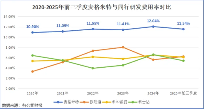 横向与国内同行相比,麦格米特的研发费用率一直保持在高比例领先的状态,2025年前三季度,欧陆通、科华数据、科士达等同行研发费用率仅在6%左右。