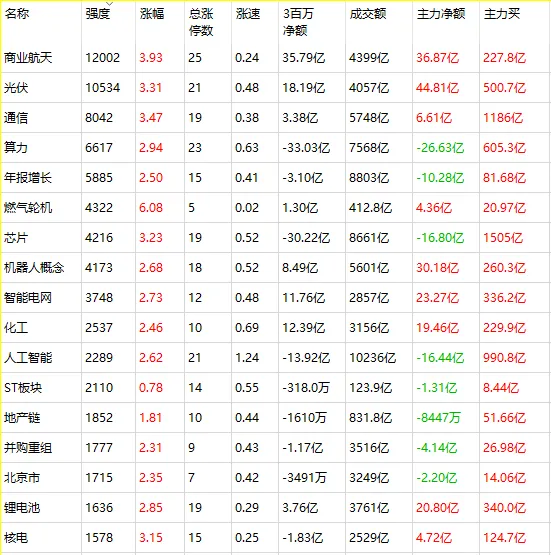 今天4800多家红盘,妥妥的普反行情,除了银行保险那几个大块头在跌,其余板块都在涨。不过强弱还是分得很清,今天轮到商业航天坐C位了。