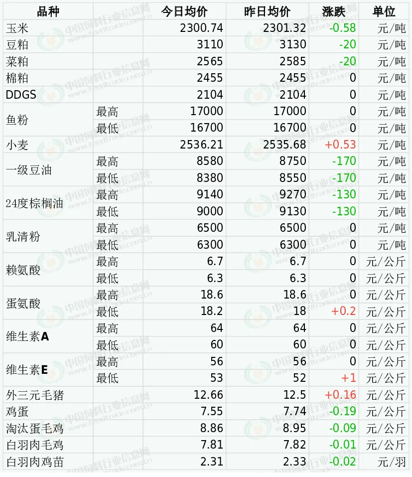 3日DDGS价格平稳。随着原粮玉米价格上涨,酒精企业生产利润多处于亏损,企业生产压力逐渐增加,饲料企业节前多滚动补库,无法对DDGS形成支撑。综合多方因素影响,我们预判2月份上半月期间大多数时候DDGS交易价格总体稳中略显偏强下半月稳中略新偏弱走势为主的可能性更大,月度均价环比继续下跌的几率依旧跟高。因国际原油期货大幅下跌,私营机构继续大幅上调巴西大豆产量预估,令CBOT大豆期货收盘略微下跌,基准期约收低0.4%。巴西大豆收割进度加快且保持创纪录产量预期,美豆出口数据低迷削弱其反弹动力,并带动进口大豆价格下调,削弱成本端对市场的挺价动力。国内进口大豆及豆粕库存仍处于中等偏上水平,随着春节的临近,终端饲料养殖企业备货接近尾声,油厂也将陆续开始停机停止报价,豆粕价格将维持小幅震荡调整行情。今日棉粕市场价格稳定为主。上周油厂大豆压榨量升至230万吨,节前备货窗口收窄,油厂挺粕动力下降,对棉粕提振作用有限。不过近来棉籽价格走势偏强,对成本有一定支撑作用,同时棉粕供应压力下降后利多行情。短期棉粕依旧震荡调整走势。今日郑州菜粕期货平开后震荡下跌。加拿大油菜籽期货收盘下跌,基准期约收低0.46%,主要受到国际原油期货和芝加哥豆油走低的拖累。菜粕现货跟盘下跌,广西油厂开始压榨澳大利亚油菜籽,市场预期菜籽粕供应紧张局面将逐步缓解,叠加春节备货进入尾声,预计菜籽粕价格存在下行压力。外盘方面价格坚挺,其中秘鲁新季超级蒸汽鱼粉预售参考价格为CNF2150美元/吨,上涨50美元/吨。国内进口鱼粉市场,持货商心态坚挺,部分品质鱼粉价格有所上涨。当前秘鲁超级蒸汽鱼粉价格集中在16700-17000元。节前鱼粉市场有望保持坚挺。今日小麦市场价格延续偏稳态势,个别企业上调收购价格。目前,小麦市场在“政策稳供”与“刚性需求”的双重作用下,呈现“稳中偏强、窄幅震荡”行情。部分原粮库存偏低的企业为维持生产,不得不被动提价收购,推动局部小麦价格偏强震荡。昨日CBOT豆油市场继续震荡回调。昨日马来西亚棕榈油市场因假日休市。昨日国内油脂期货市场延续弱势集体下挫,贵金属史诗级暴跌及中东局势出现缓和迹象引发国际原油深度回调,金融市场系统性风险集中释放,国内油脂板块承压继续对此前连涨行情进行修正。尽管马来西亚1月棕榈油出口增加、产量下滑使得供需基本面不断改善,但随着春节临近,国内油脂备货整体渐入尾声。市场情绪由涨到跌突然切换,下游观望心态趋强,需求端对油脂价格的提振作用减弱。内外盘、期现货以及油脂板块内部形成多重弱势共振,节前油脂板块再度冲高的难度显著增加。节前备货临近尾声,下游接货意愿减弱,油厂开工稳定、供应充足,叠加期货盘面走低拖累,预计短期油脂现货价格震荡调整。中美贸易冲突缓和,互相取消额外的商船岗务费,国内港口乳清粉到货量趋于好转,大猪仔猪价格低迷,乳清粉市场报价稳中偏弱整理,后续需注意关税谈判进展以及港口库存量等因素。2025年12月,我国赖氨酸与赖氨酸盐及酯的出口量为9.8万吨,同比增0.4%,环比增8.4%。11月万里润达氨基酸生产线计划阶段性升级检修。出口较好加上玉米价格有所上涨,2月2日市场称金玉锋98.5%赖氨酸报价6.5元/公斤,70%赖氨酸报价4.5元/公斤 。市场稳中偏强运行。2025年12月国内蛋氨酸进口量为2.1万吨,同比增10.6%,环比增66%.市场称希杰马来西亚蛋氨酸工厂12月至2026年1月初检修,12月26日市场称新和成固蛋工厂部分生产线计划1月中下旬开始停产检修2-3周。12月31日市场称新和成固蛋提价至18.5元/公斤。1月8日市场称宁夏紫光蛋氨酸价格上调7%。1月30日市场称安迪苏液蛋提价10%。欧洲VA1000市场报价15-16欧元/公斤。2025年3月万华化学VA产业链投产。6月12日巴斯夫VA解除不可抗力影响。10月28日市场称部分厂家报价提至70-72元/公斤。2026年1月6日市场称新和成VA提价至70元/公斤。2026年1月15日市场称浙江医药VA提价至75元/公斤。欧洲VE市场报价5.5-5.8欧元/公斤。11月3日市场称益曼特计划自11月初检修至12月底。12月市场称部分厂家VE产品提价至65-68元/公斤,12月30日市场称浙江医药VE产品停报。1月13日市场称浙江医药VE产品提价至72元/公斤, 市场稳中偏强运行。全国均价为 12.50元/公斤,较昨日价格上涨1.28%。月初集团企业出栏节奏较前期有所减缓,供应压力暂时稍减;加之猪价接连下调后,部分社会猪源有惜售情绪,支撑猪价止跌反弹。屠宰端来看,增量趋势不明显,部分稳定部分有增。随着春节备货带动需求提升,屠宰端收购意愿将随之增强,预计短期猪价稳中偏强。今日鸡蛋价格下跌。供需失衡叠加市场恐慌,供应端蛋鸡存栏高位、贸易商与养殖户节前集中出货致流通量激增,需求端家庭备货完成、集团消费因停工放假大幅缩减,叠加期货走弱加剧看跌情绪,春节推迟也让备货需求提前释放,形成节前需求空档。 预计近期蛋价偏弱运行。今日主产区山东鸡蛋均价7.53元/公斤,较昨日价格下跌0.16;河北鸡蛋均价7.23元/公斤,较昨日价格下跌0.17;广东鸡蛋均价7.47元/公斤,较昨日价格下跌0.20;北京鸡蛋均价7.94元/公斤,较昨日价格下跌0.24。全国淘汰蛋毛鸡均价下跌。因节前备货结束需求降低,养殖户集中出栏致供给增加,叠加屠企压价、市场看跌,短期价格稳中小调,节后或继续走弱,主产区有刚需和成本支