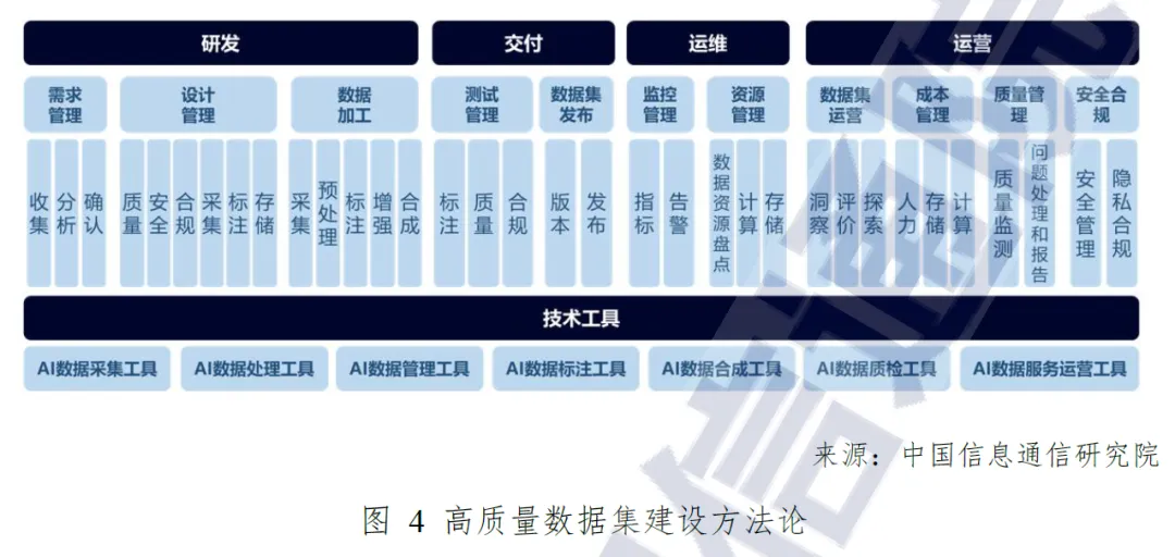供给方主要包括开源社区(魔搭、飞桨等平台提供基础数据集)、专业数据服务商(海天瑞声、数据堂等拓展产品体系)、数据标注基地(成都、沈阳等 7 个基地形成上百个高质量数据集)和数据交易场所(北京国际大数据交易所发布约 300 个数据集)。高质量数据集建设形成 “场景驱动”(需求拆解 - 数据设计 - 采集 - 处理 - 质检 - 运营闭环)和 “数据驱动”(基于多源数据挖掘潜在需求)两种模式,需执行研发、交付、运维、运营四大核心环节,依赖数据采集、处理、管理、标注、合成、质检、服务运营七项关键技术能力。