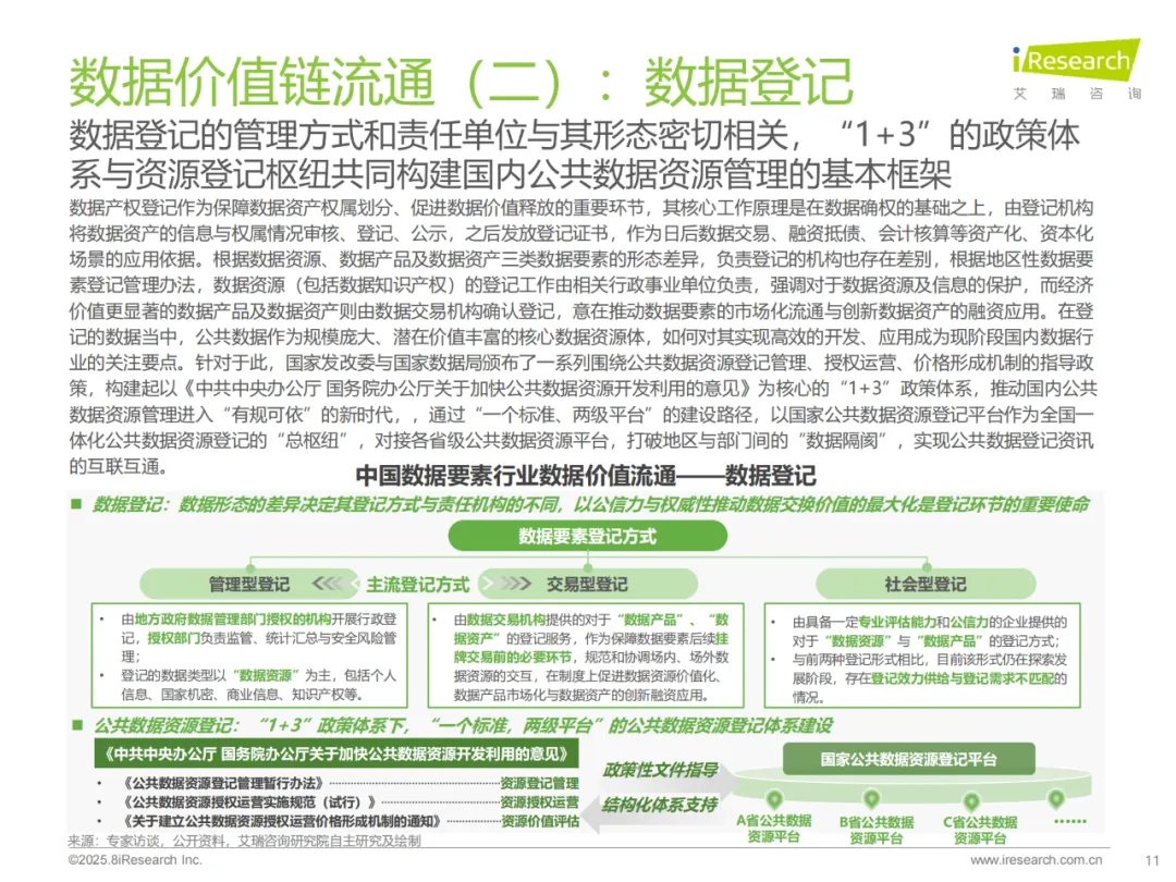 公共数据资源开发利用 “1+3” 政策体系初步形成。2024 年 9 月,中办、国办印发《关于加快公共数据资源开发利用的意见》,明确政务数据共享、公共数据开放、公共数据授权运营三大方向,扩大数据有效供给。政务数据共享迈入法治化阶段,2025 年 6 月《政务数据共享条例》公布,构建 “一盘棋” 统筹、“一本账” 管理等制度框架,近 5 年全国政务服务平台数据共享累计超 5400 亿次,电子证照共享超 108 亿次,上海、重庆等地通过数据共享实现惠企政策 “免申即享”、基层报表减负 70% 以上。公共数据开放方面,截至 2024 年 7 月,全国 243 个省级和城市政府上线数据开放平台,开放有效数据集 370320 个,山东、无锡等地出台实施细则,细化目录管理、获取流程等要求;行业层面,物流数据开放互联试点启动,为跨行业数据开放提供借鉴。公共数据授权运营通过《公共数据资源登记管理暂行办法》《公共数据资源授权运营实施规范(试行)》等三份配套文件明确方向,国家公共数据资源登记平台已收录 1.1 万余项公共数据资源、700 余项数据产品和服务,福建等地下发收费标准,首批政府指导定价产品合同金额超百万元。