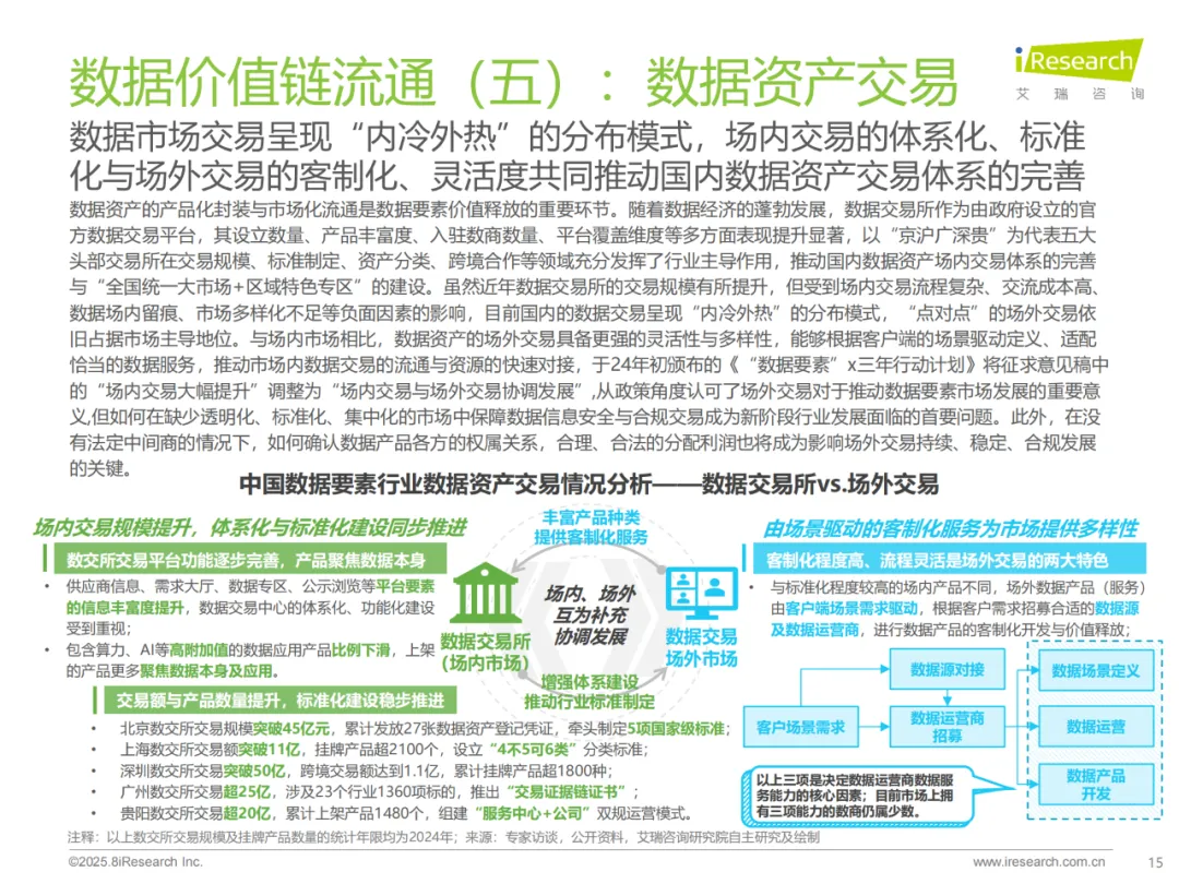 2024 年全国数据市场交易规模预计超 1600 亿元,其中场内交易(含备案)规模超 300 亿元,场外交易仍是数据供需匹配的主要途径。场外交易模式(数据采购、接口交互、终端订阅等)在金融征信、商业信息查询等领域形成成熟格局,但也存在垄断风险(如知网滥用市场支配地位案)。