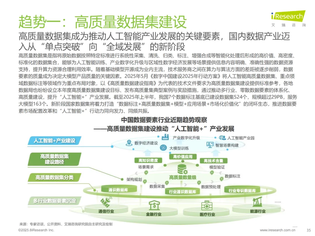 高质量数据集建设加速推进。2025 年 2 月,国家数据局组织 27 个部委启动高质量数据集建设,国务院国资委围绕 10 个领域推进中央企业数据集建设并发布 30 项优秀成果,地方通过遴选评审、奖补政策等引导企业参与,着力解决高质量数据集供给规模不足问题。