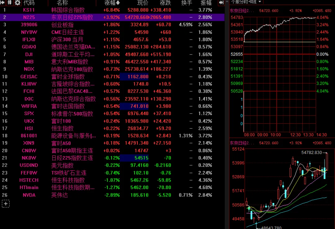 2月3日午后,日本及韩国股市持续上行。其中,日经225指数盘中暴涨2000点,涨幅一度超过4%,再创历史新高;韩国综合指数一度大涨超7%,完全收复了昨日的跌幅。韩国半导体芯片股集体走强,SK海力士、三星电子涨幅均超过8%,爱德万测试涨超7%,韩美半导体涨超6%,东京电子涨超5%。摩根大通的分析师称,韩国基准的韩国综合指数在1月份突破5000点后,到2026年或将达到7500点。他们将该指数今年的基本情景目标设为6000点,乐观情景目标设为7500点。韩国已将自己定位为英伟达等全球行业领导者的核心供应商。富兰克林邓普顿全球投资的投资组合经理Yiping Liao表示