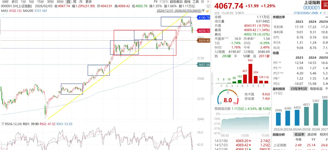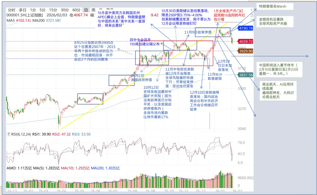 从技术面来看,上证指数此次调整下穿突破了1月中旬以来形成的震荡区间,正好踩在了2025年11月-年底之间由于年底前机构获利了结导致交易清淡等因素造成的震荡区间突破上方,因此预计将在这里获得较为有力的支撑。