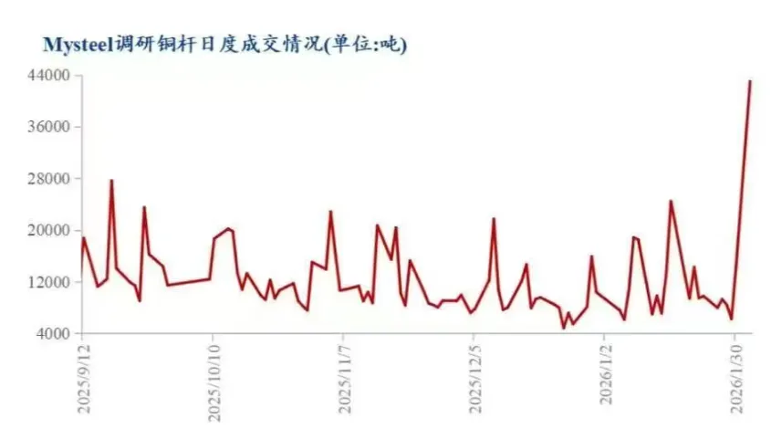 (2)2月2日根据Mysteel调研国内31家铜杆生产企业(含精铜杆、再生铜杆企业,涉及年产能601万吨)和6家贸易商反馈,当日铜杆订单量为4.30万吨,较上一交易日增2.86万吨,环比涨幅197.73%。其中精铜杆订单量为4.17万吨(创调研以来历史新高水平),较上一交易日增2.90万吨,环比涨幅228.75%。再生铜杆订单量为0.14万吨,较上一交易日减0.04万吨,环比降幅23.03%;实际成交价格99000-99400元/吨自提,99200-99400元/吨送到。这意味着铜价下跌的时候,选择入场的产业资金较多。
