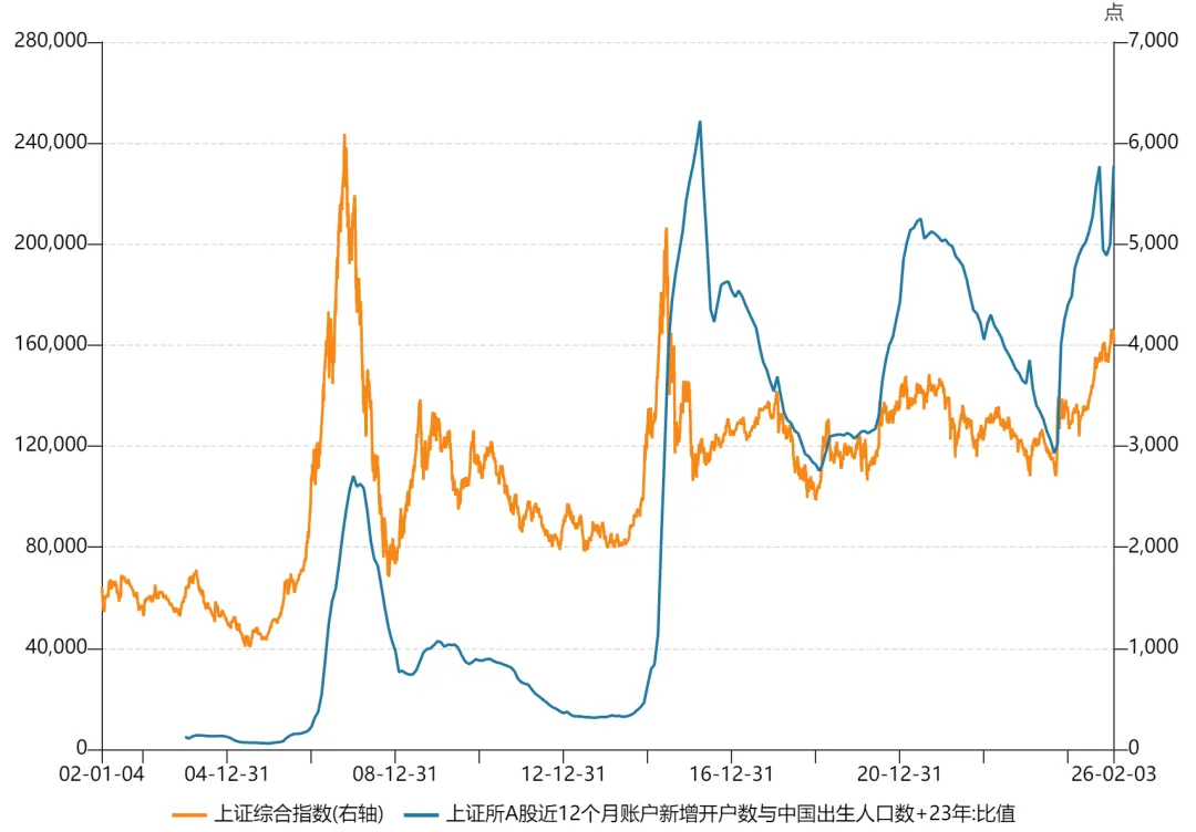 上交所数据显示,2026年1月A股新开户491.58万户,环比增长89%,同比增长213%,这个数据说明新开户数量很活跃。瞎算了一个数据,近12个月新开户数量相对于年轻人进入社会的比例,或者说是速度。实际上近12个月新开户数量会很杂,有很多各种年龄段的人,出生人数+23岁大概就是当年本科毕业1-2年的年轻人。单纯去比较新开户数量的历史对比,会有一个问题,因为中国人口数量增长本来就是放缓的,以及股民的基数越大,增长率也会变慢,所以我简单选择23岁年轻人这个指标作为一个量纲,去衡量开户数量的速度,做出一个很粗略的图。