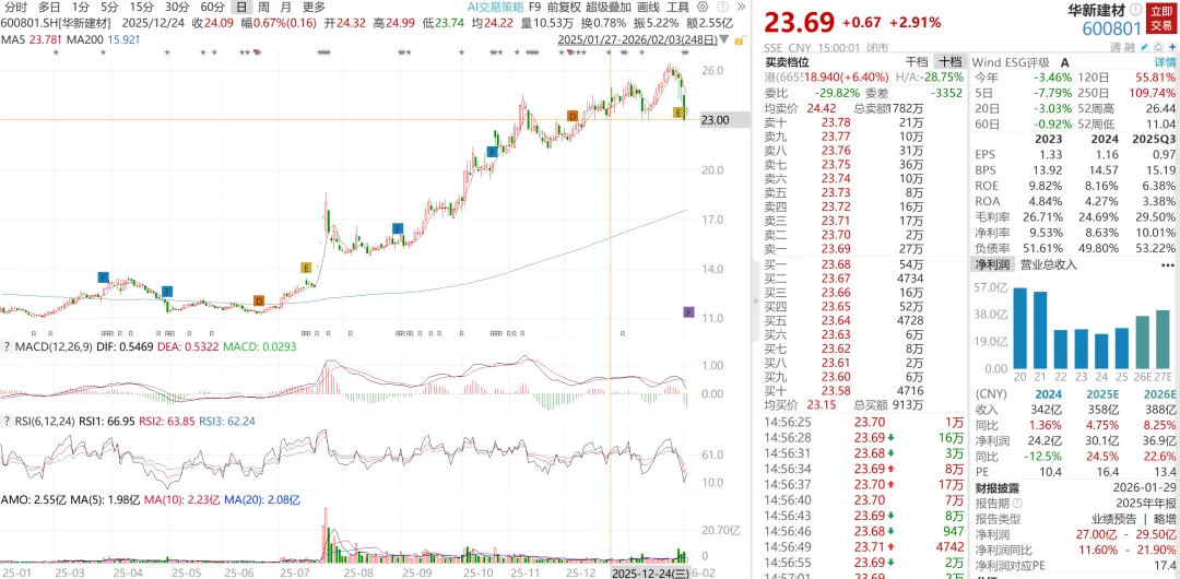 华新建材发布公告,持股5%以上股东华新集团有限公司于2026年1月12日至2026年2月2日期间增持公司股份1547万股,占公司总股本的0.74%,增持后持股比例达到17.00%。2025年前三季度,华新建材实现收入250.33亿元,归母净利润20.04亿元。这家企业政策暗示人民币升值的中长期目标或为6中我们Q过,彼时华新建材12月24日公告说要在6个月内增持不低于2亿元、不超过4亿元。如今已经增持了差不多了......但是股价在增持了之后并没有回升特别多,反而在近期的调整后跌幅较大。我觉得公告之后就立马增持,算是管理层比较有诚意的一种表现了......