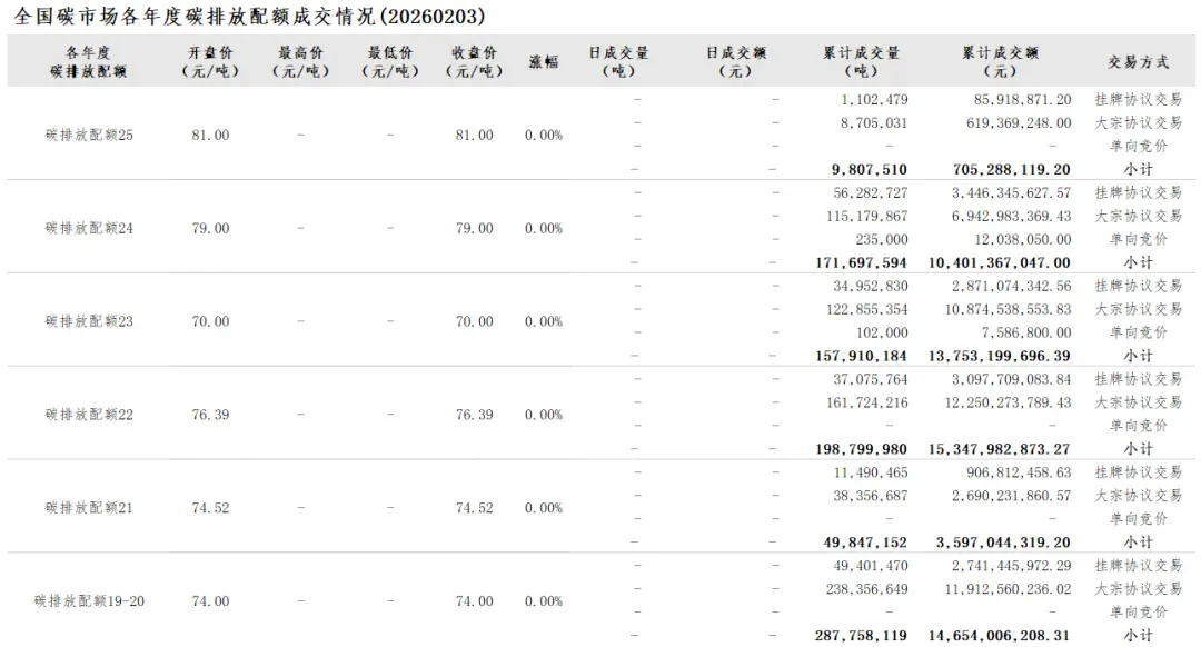 2026年1月1日至2月3日,全国碳市场碳排放配额成交量10,954,019吨,成交额796,270,031.80元。