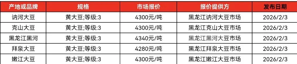 2026年2月3日,大连商品交易所黄豆一号2605合约开盘报4397元/吨,终盘收于4384元/吨,单日下跌9元/吨,跌幅0.20%;盘中最高上探4435元/吨,最低下探4379元/吨,当日持仓量报249206手。