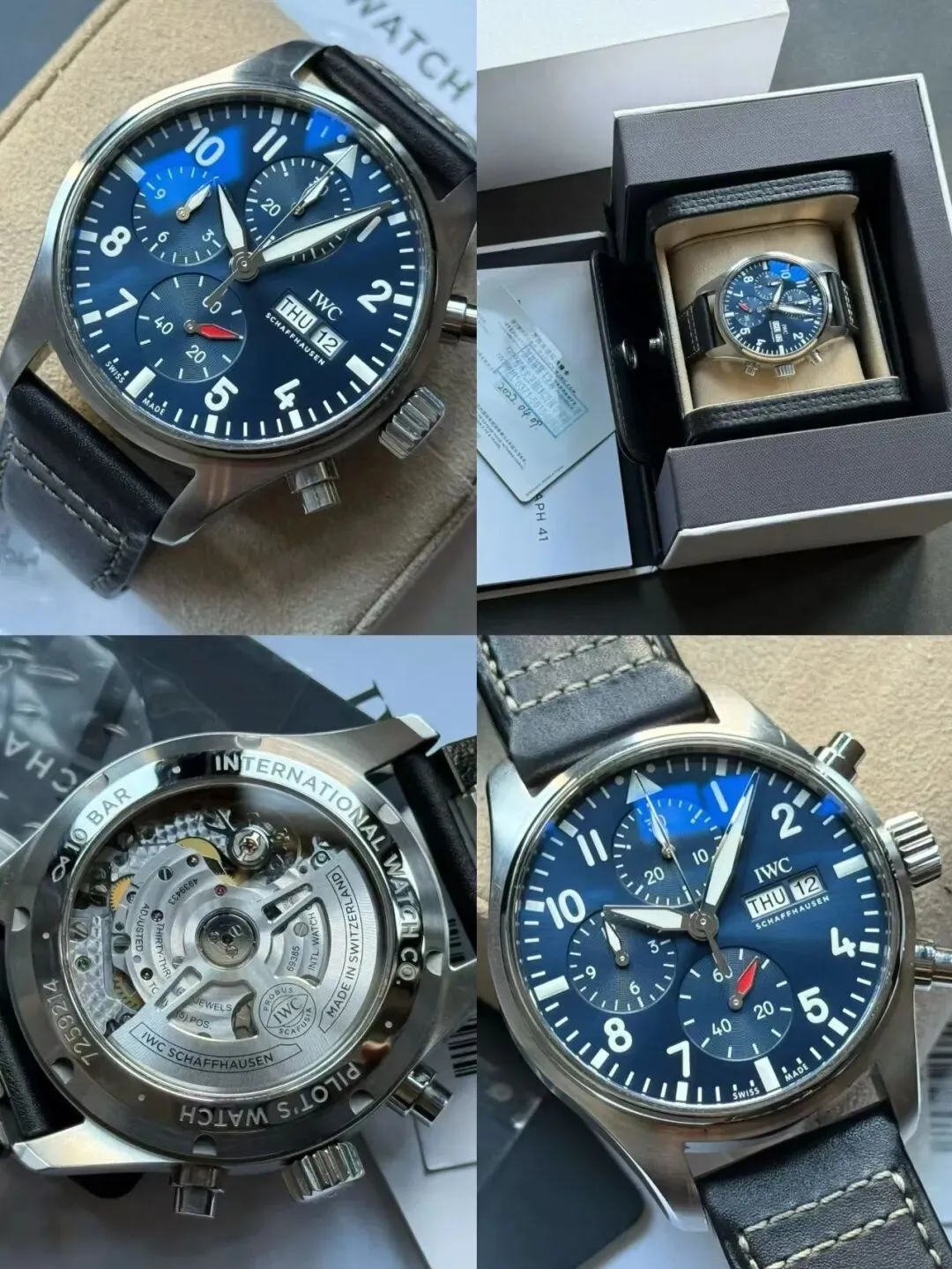 直径41毫米,不锈钢表壳,计时、星期、日历功能,使用万国69385自动计时机芯,全套附件,保卡日期2022年,97新成色。