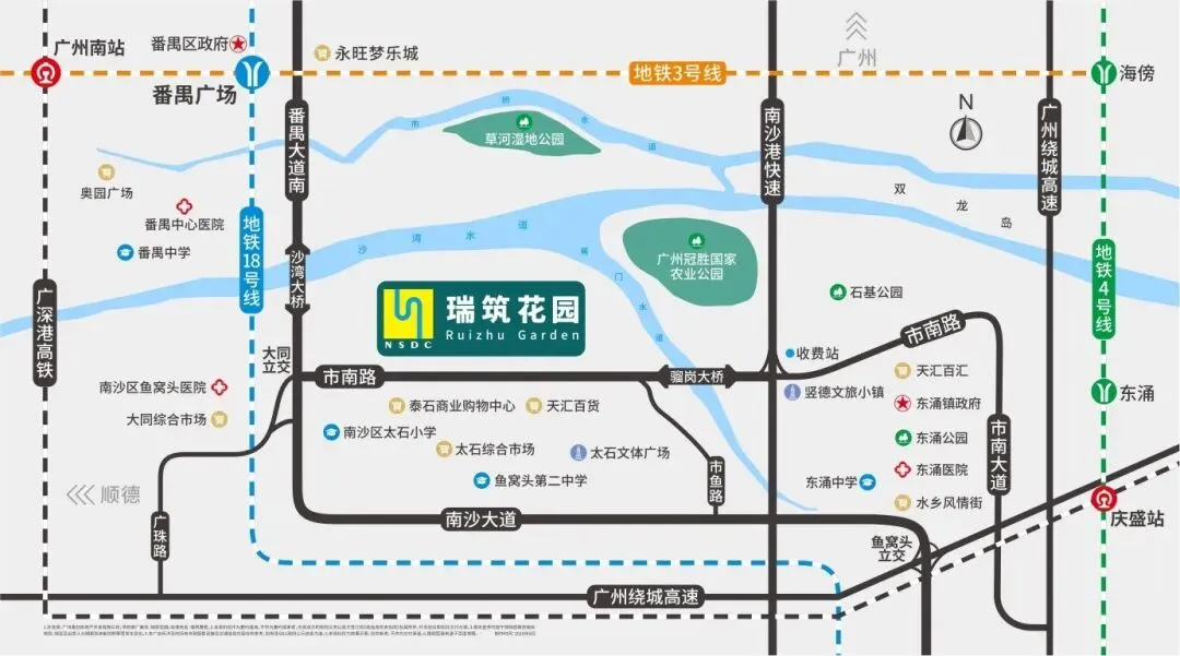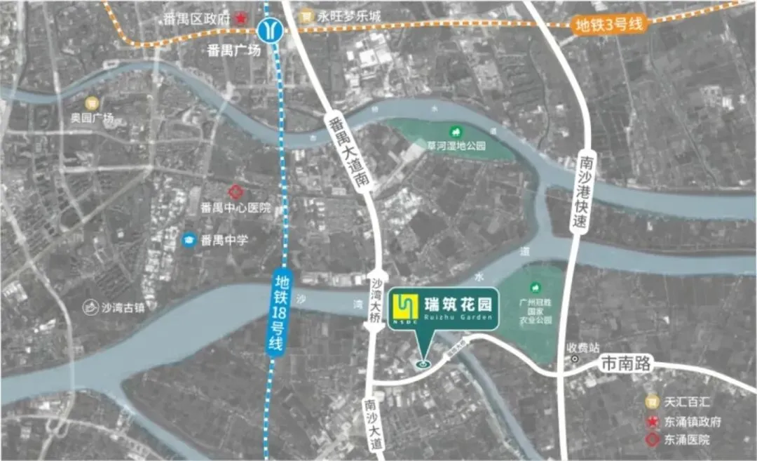高速:紧邻南沙大道,通过沙湾大桥可直达番禺,距离南沙港快速约1.7公里,驾车可快速到达广州各区。