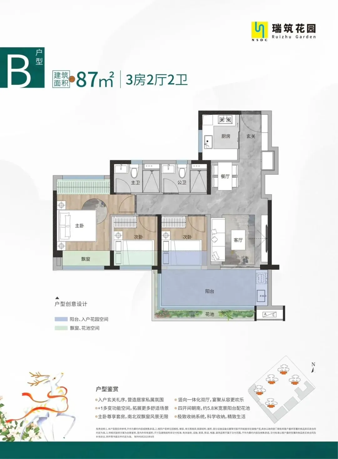 87㎡3房2卫,四开间朝南,一体化双厅设计,约6米阔绰尺度,南向四开间,约5.8米宽幕阳台。