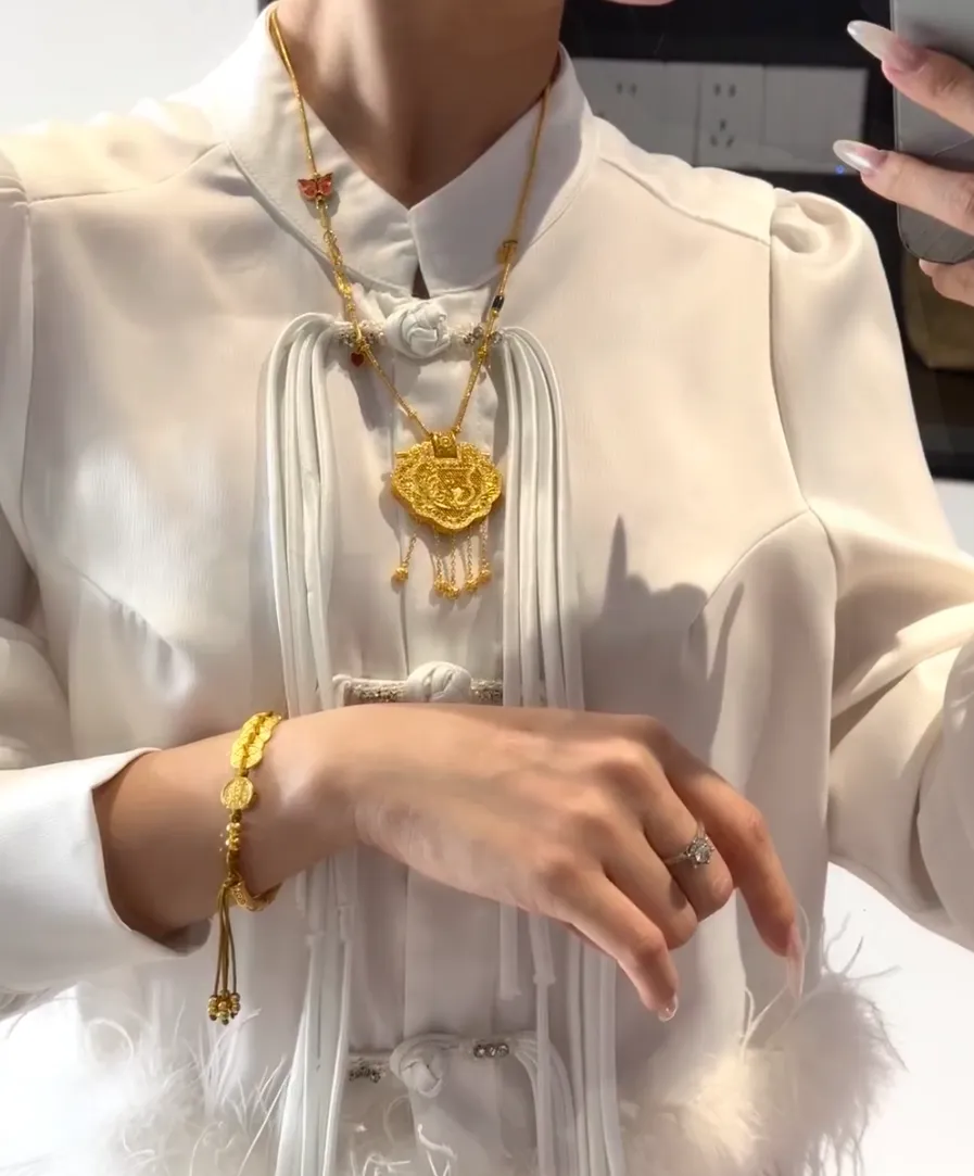 说回我最近刚入手的黄金首饰 就是图里这套 真的每次戴都被问爆 首先材质是足金999 比那种18K的金色更正就是那种一眼就能看出来的贵气感 工艺超细腻 项链主坠是传统祥云纹加蝴蝶点缀 细节拉满 重量大概13克左右 戒指和手链各自都在6克上下 现在金价跌到一千多一克 我入手的时候价格算下来项链差不多二万出头 手链跟戒指一起7千出头 真的比高点入手直接省了小一千块钱 这种感觉有点像捡到宝 emoji表情都不够形容我的开心