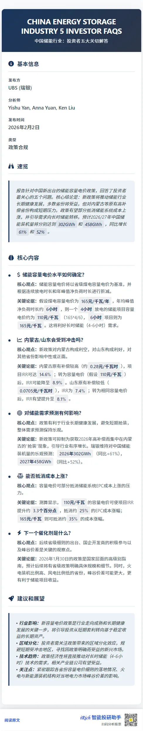 瑞银全球研究发布了一份关于中国能源存储行业的最新报告,针对投资者关心的五大问题进行了深入探讨。这份报告聚焦于2026年初出台的储能容量定价政策,揭示了行业从补贴驱动向市场化转型的关键转折点。本文将基于瑞银的洞察,结合行业背景,对政策影响、区域分化、需求前景及投资风险进行结构化拆解,为投资者提供清晰的决策参考。容量定价机制:从“补电量”到“补容量”的革命性转变