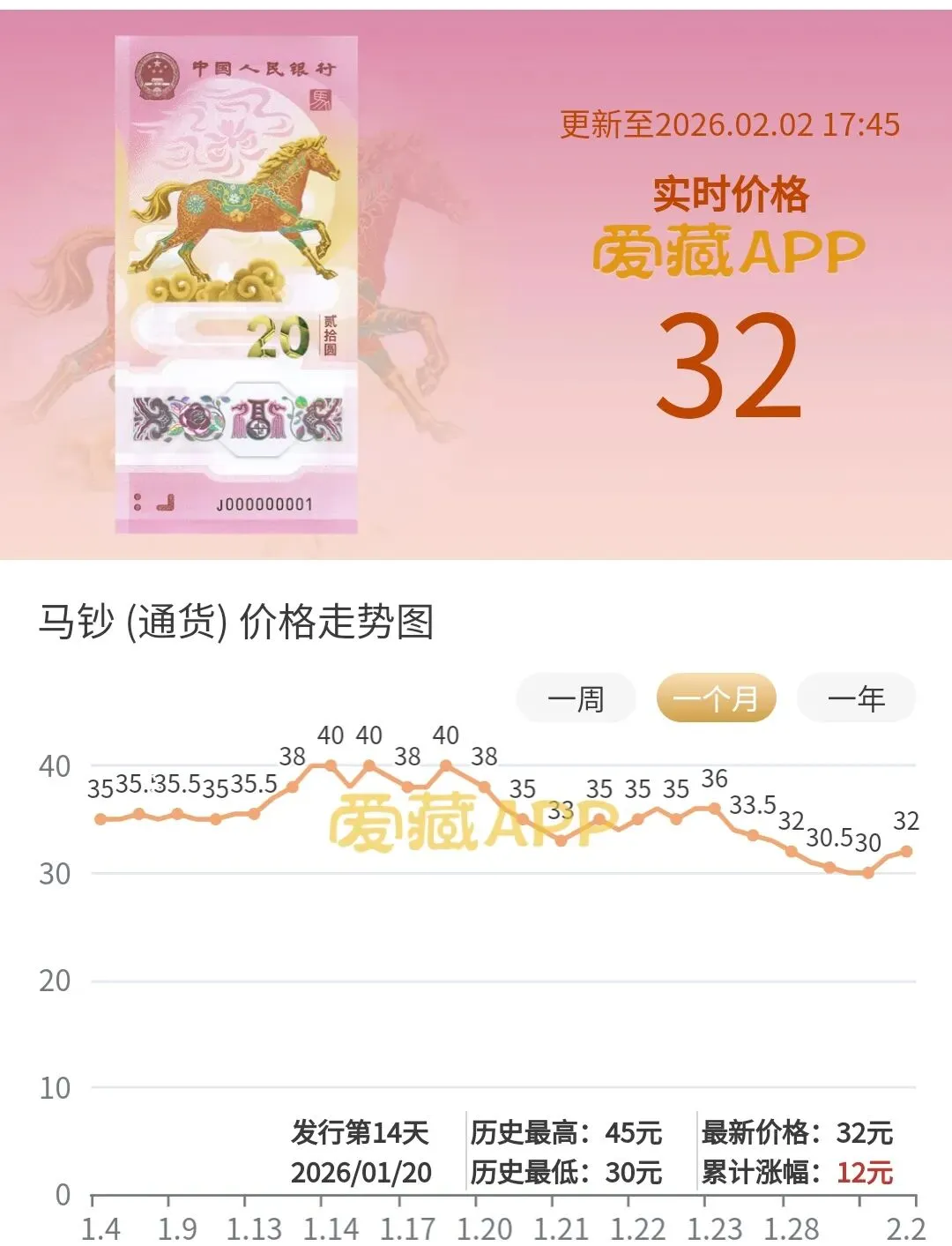 当然2026年马年纪念钞,目前市场行情也有一些回暖,记得同样在上周,2026年马年纪念钞通货品种已经跌破30目前来看也已经回到30以上,2026年马年纪念钞通货品种最新市场报价基本上能保持在30~320元左右。