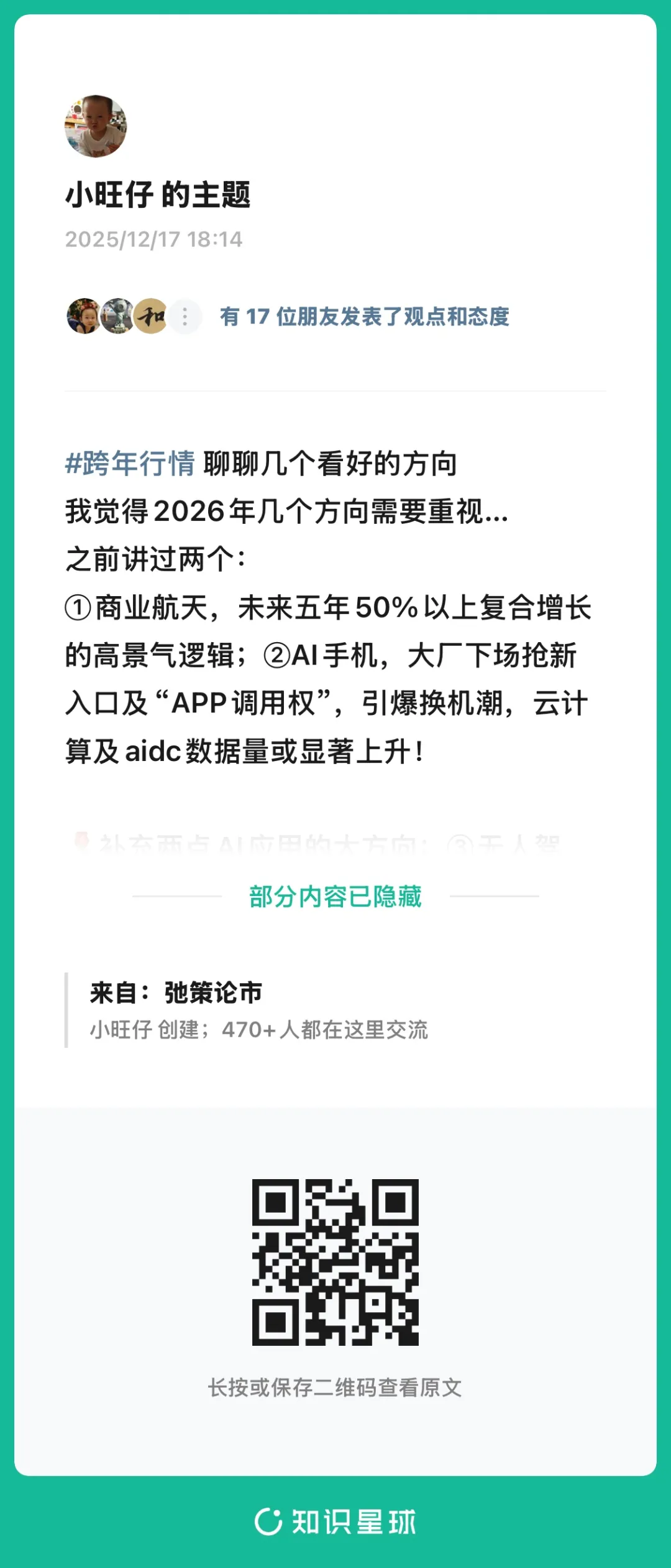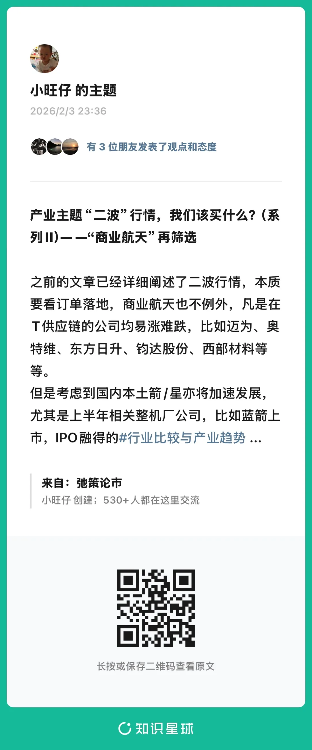 但是考虑到国内本土箭/星亦将加速发展,尤其是上半年相关整机厂公司,比如蓝箭上市,IPO融得的资金将成为其未来的capex扩张,从而带动整个产业链进入加速发展。因此,一部分潜在受益于订单上升的低位票,我们也梳理出来,供大家参考。我这边的核心价值,一定是提前埋伏,不追高,因为短炒不是散户擅长的事,其实也不是大部分基金经理的擅长。我有个朋友提出两种赚钱模式:①左侧埋伏产业,赚行业一波大beta,静待券商各种吹爆,情绪进入高点出货;②在券商开始吹产业大机会时,形成一波较短周期、加速上涨且波动率较大的机会,你可以赚个20~30%离场,同样可以赚到钱。但如果你选了后者,却自以为站在产业趋势的起点,那恐怕赚到的钱都要“吐回去”甚至亏损— —因此,每次投资都要思考,你在赚哪一块哪一种的钱?方知何时进何时退。